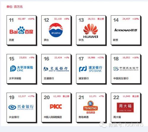 值得一提的是,今年榜单上50大品牌的总价值与去年相比增长22%,创造了最佳中国品牌价值排行榜发布以来的最大增幅,其中,互联网品牌价值占比从去年的11%增至24%,行业排名跃居第二。