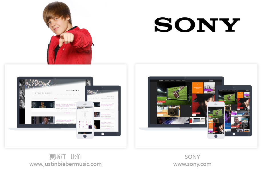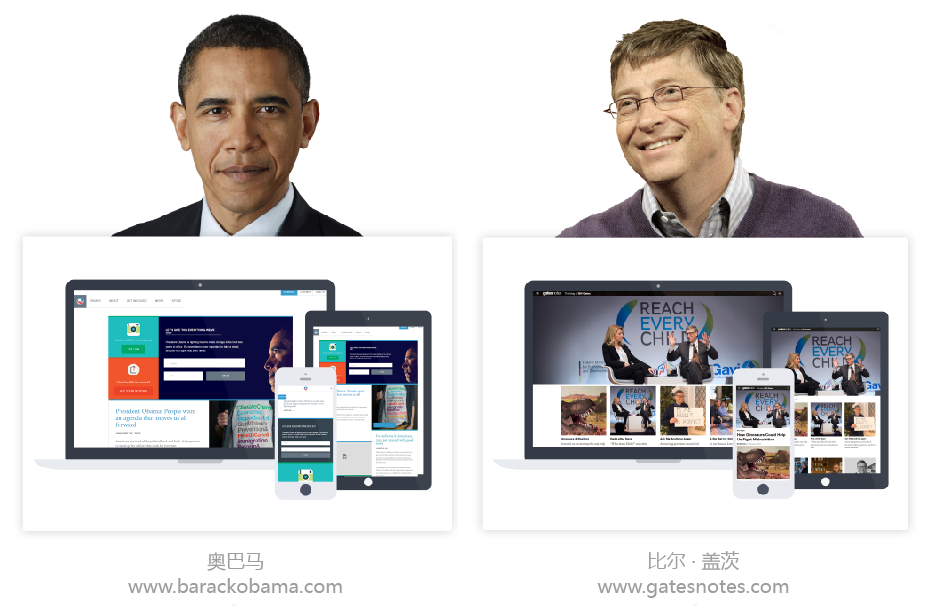 在移动互联网超强的旋风下,响应式网站成为香饽饽,不仅能拿下PC端,还能掌控移动端,而这一得天独厚的优势也让他成为众多名人、名企的掌中宝。其中,美国现任总统奥巴马在2012年连任大选中,凭借他的响应式个人官网拿下了23%的移动端用户,获得了2.5亿美元的捐款,让他的成功连任得以实现。美国首富比尔·盖茨和他的妻子梅林达在2000年成立的比尔和梅琳达·盖茨基金会的官网也是响应式的,在改善全球卫生和教育的平等方面有着重要的意义。此外,贾斯汀·比伯、泰勒·斯威夫特、小甜甜布兰妮等明星的网站也是响应式的,除了对于自身的形象宣传,官网还有网站商店,用以销售唱片、书籍或者设计的时尚单品。而且,微软和sony这样的大企业也对移动互联网的发展有所行动,他们的官网也已经是响应式网站。